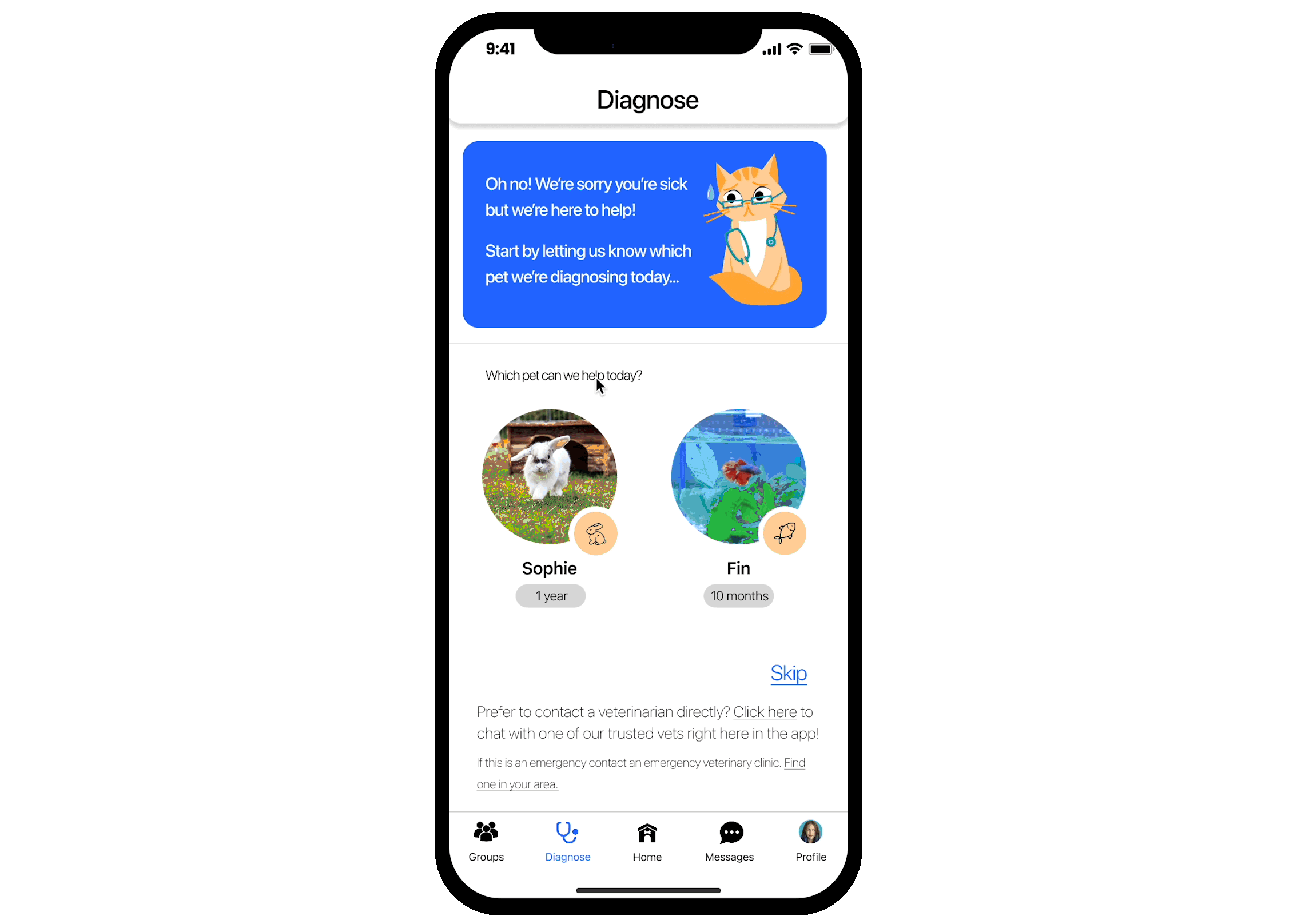 The Diagnose, Home, and Messages work in collaboration to help you diagnose your pet and work toward a treatment for them.