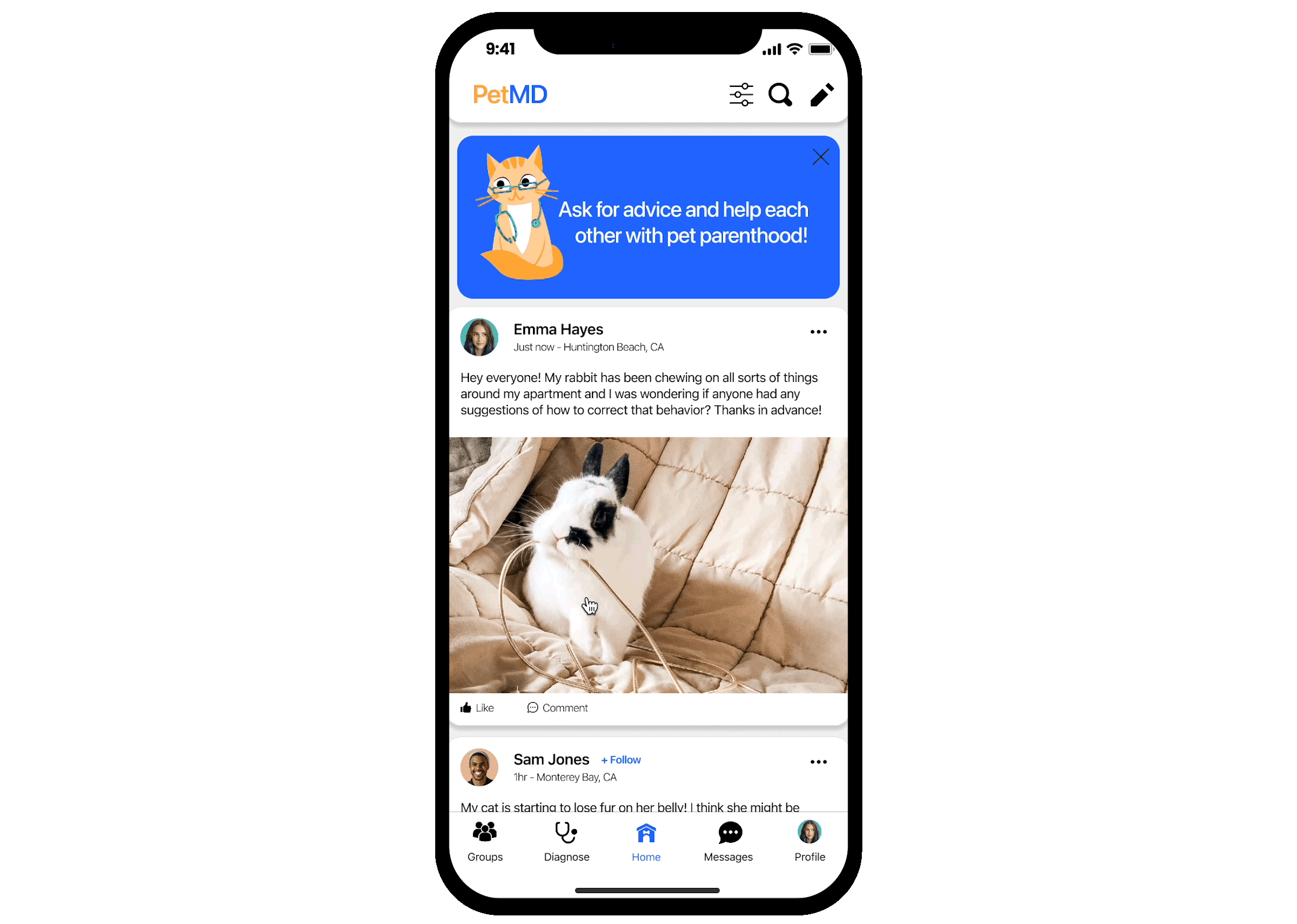 In this example, the user makes a post asking for advice about her bunny’s behavioral quirk and adds her location so that she shows up on local user’s feeds.