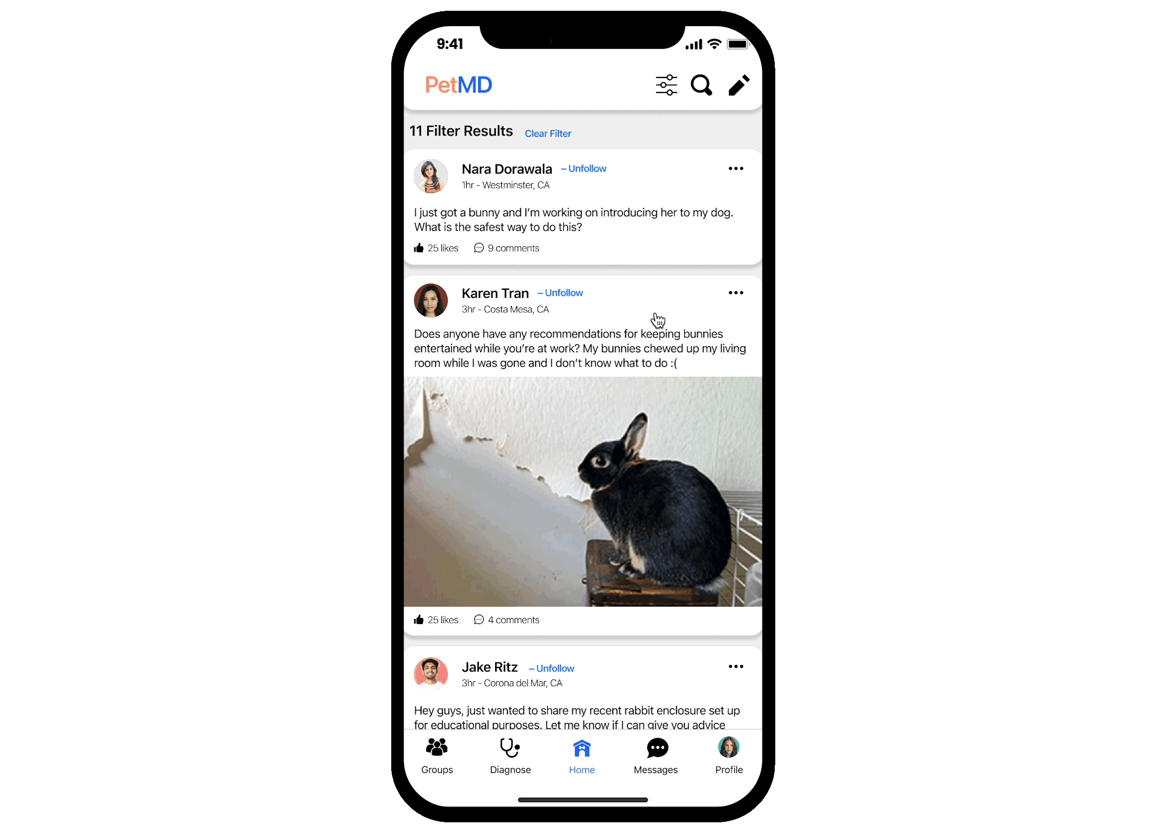 In this example, the user used the filter option to only see posts from their friends and only posts relating to rodents so that they can see which of their friends also have bunnies and see if any of them have dealt with similar issues to what they are facing.