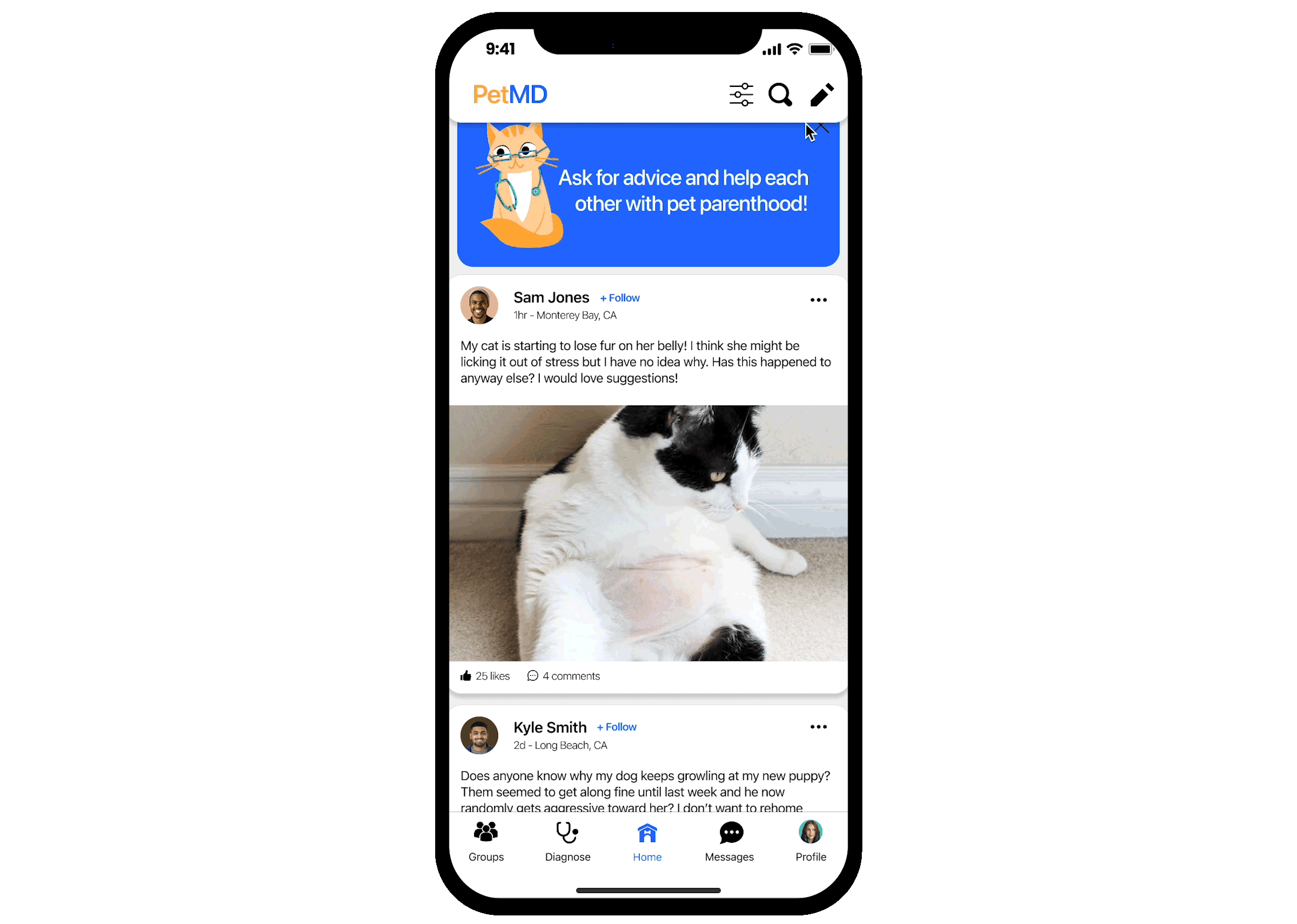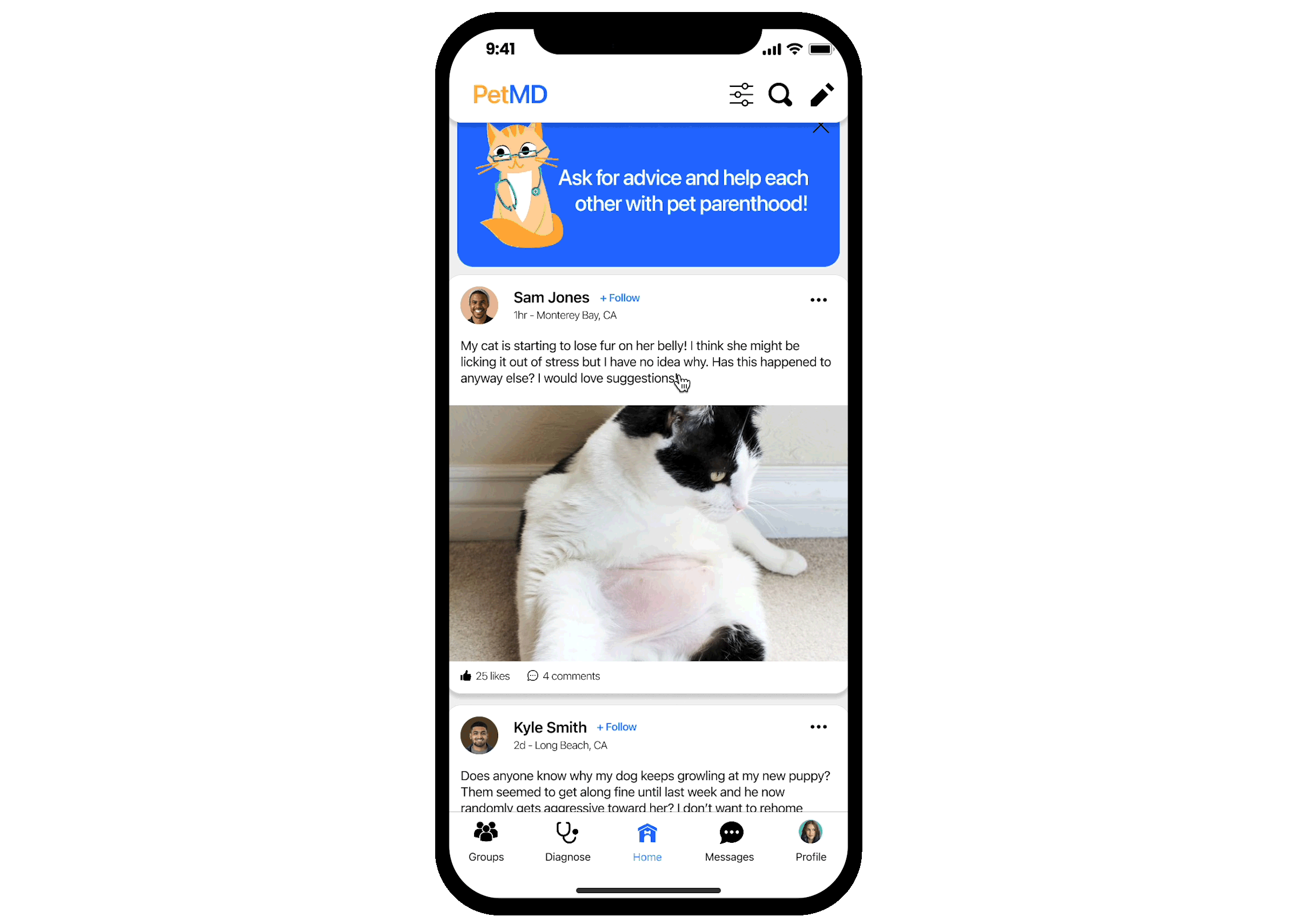 Ask questions, get suggestions, and connect with your pet parent community through the Home page. Pet parents can also categorize their posts by animal, concern level, and issue type so that the post finds the right audience.
